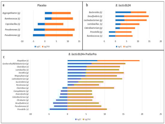 Changes in specific taxa within treatment groups, identified using a gene-wise negative binomial generalized linear model (EdgeR). (a) Placebo (b) lactis BL04 (c) lactis BL04+PreforPro, Log Fold Change = logFC; log Count Per Million = logCPM.