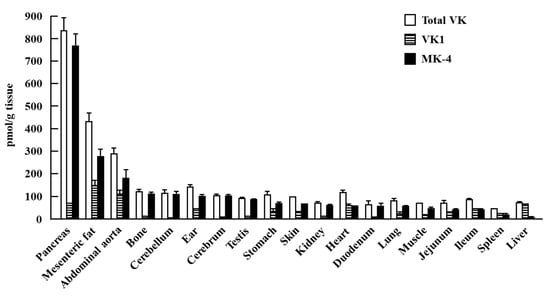 Vitamin K (VK) is a fat-soluble vitamin that exists in two natural forms: VK1 (phylloquinone) and VK2 (menaquinone). VK1 is the major form of dietary VK, which is abundantly present in leafy greens []. VK2 is present in dairy products and fermented foods [], and a homolog of VK2, menaquinone-4 (MK-4), is the major form of VK in animal tissues and is converted from a portion of the ingested VK1 and other menaquinones []. The postmortem evaluation of VK status in human tissues, including brain, heart, kidney, liver, lung, and pancreas, revealed that VK1 was stored in all tissues, but with relatively high levels in the liver, heart, and pancreas, whereas VK2 was stored in most of the tissues and had relatively high distribution in the brain, kidneys, and pancreas []. In rodents, we previously found that both VK1 and MK-4 are present in all tissues, including the brain, heart, kidney, liver, lung, pancreas, mesenteric fat, abdominal aorta, bone, ear, testis, stomach, skin, intestine, muscle, and spleen (Figure 1). The abovementioned finding was consistent with the results reported from an early study that MK-4 is the major form of VK throughout the body [] and is observed in high quantities in the liver, bone, brain, pancreas, and reproductive organs, even when animals are fed a low-VK diet [,]. The accumulation of VK in the tissues suggested that it has specific physiological roles in the human body.