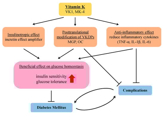 Several recent studies have mentioned that VK not only plays a role in blood coagulation and bone metabolism but also has specific functions in the regulation of glycemic status; therefore, a greater status of VK may be implicated in mediating a reduced risk of DM. In this mini-review, we outline the current knowledge on the beneficial effects of VK on suppressing the progression of DM.
