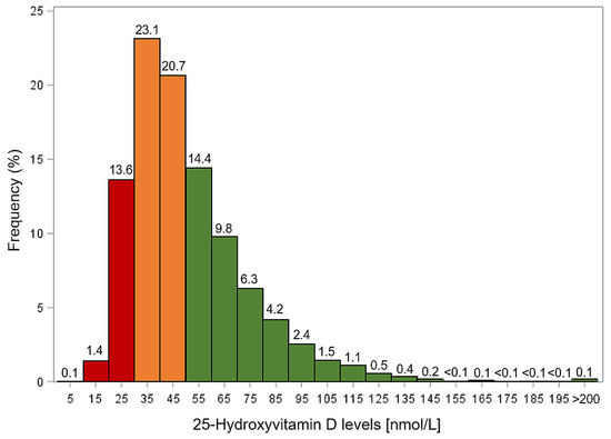 Distribution of 25-hydroxyvitamin D (25(OH)D) levels among study participants. Red columns: vitamin D deficiency; orange columns: vitamin D insufficiency; green columns: sufficient vitamin D status.