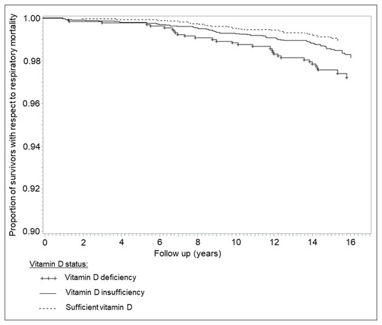 Kaplan-Meier curves for deaths from respiratory disease according to vitamin D status (unadjusted).