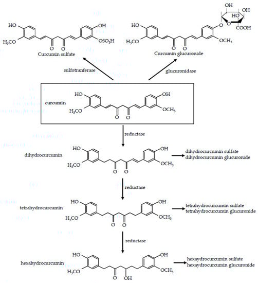 In humans, after curcumin oral administration, glucuronide conjugates and sulfate conjugates are detected in blood, while intact curcumin is poorly detected [44]. As a first step, ingested curcumin passes through the stomach, where practically no absorption takes place. Due to its resistance to low pH, curcumin, without any chemical modifications, reaches the large intestine and undergoes extensive phase I and II metabolism. Firstly, it is metabolized by phase I enzymes: different reductases introduce reactive and polar groups in their substrates, yielding active metabolites, namely, dihydrocurcumin, tetrahydrocurcumin, and hexahydrocurcumin [45,46,47] (Figure 1). This reductive metabolic reaction of curcumin occurs extensively in enterocytes and hepatocytes [46,48,49].