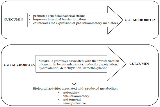 Overall, all these results demonstrated that gut microbiota had a profound impact on the biotransformation of curcumin, also showing the huge potential of curcumin metabolites produced by the intestinal microflora as promising substances for the prevention or treatment of many diseases. The bidirectional interaction between curcumin and gut microbiota is reported in Figure 2.