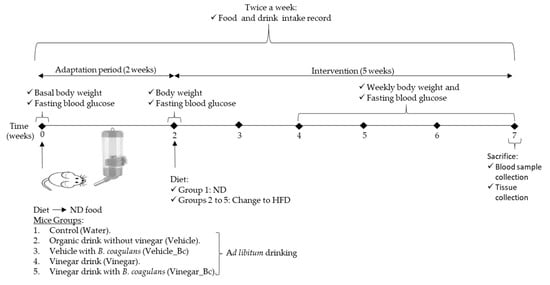 (1) Water, (2) Organic drink without vinegar (Vehicle), (3) Vehicle with B. coagulans GBI-30 6086 (Vehicle_Bc), (4) Apple vinegar drink (Vinegar), (5) Apple vinegar drink supplemented with B. coagulans GBI-30 6086. (Vinegar_Bc). The different groups were acclimatized for 2 weeks with a normal standard pellet diet (ND).