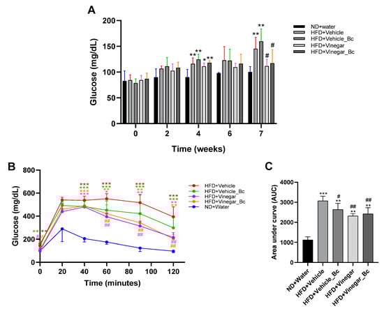 Vinegar and B. coagulans improved glucose homeostasis. (A) Fasting blood glucose measured at several time points during the experimental procedure, (B) Blood glucose levels in response to glucose tolerance test at week 7, (C) Effect on area under the curve (AUC). Abbreviations. ND: Normal diet; HFD: High fat diet; ND+Water: Normal diet plus water; HFD+Vehicle: High fat diet plus vehicle (non-vinegar), HFD+Vehicle_Bc: High fat diet plus vehicle and B. coagulans; HFD+Vinegar: High fat diet plus vinegar; HFD+Vinegar_Bc: High fat diet plus vinegar and B. coagulans. Data are expressed as mean ± SD. * p < 0.05, ** p < 0.01, *** p < 0.001 vs. ND, # p < 0.05, ## p < 0.01 vs. HFD+Vehicle group. (n = 6 mice per group).