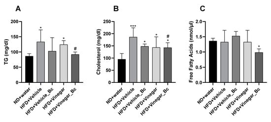 Serum lipid profile in HFD-fed mice supplemented with vinegar and non-vinegar drinks ± B. coagulans for 5 weeks. (A) Concentration of serum Triglycerides (TG), (B) Serum total cholesterol, (C) and serum free fatty acids (FFA) on mice fed ND or HFD, respectively. Abbreviations. ND: Normal diet; HFD: High fat diet; ND+Water: Normal diet plus water; HFD+Vehicle: High fat diet plus vehicle (non-vinegar), HFD+Vehicle_Bc: High fat diet plus vehicle and B. coagulans; HFD+Vinegar: High fat diet plus vinegar; HFD+Vinegar_Bc: High fat diet plus vinegar and B. coagulans. Values are expressed as the mean ± SD. * p < 0.05, *** p < 0.001 vs. ND, # p < 0.05 vs. HFD+Vehicle group. (n = 6 mice per group).