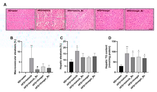 Effect of vinegar and B. coagulans on hepatic histology and TG liver accumulation in HFD-induced obese mice. (A) Representative images of H&E-stained liver sections from different animal experimental groups are shown (40 × magnification), (B) Percentage of macrovesicular steatosis, (C) Percentage of hepatic steatosis (D) and hepatic TG content on mice fed ND or HFD, respectively. Scale bar: 50 µm. Abbreviations. ND: Normal diet; HFD: High fat diet; ND+Water: Normal diet plus water; HFD+Vehicle: High fat diet plus vehicle (non-vinegar), HFD+Vehicle_Bc: High fat diet plus vehicle and B. coagulans; HFD+Vinegar: High fat diet plus vinegar; HFD+Vinegar_Bc: High fat diet plus vinegar and B. coagulans. Values are expressed as the mean ± SD. * p < 0.05, ** p < 0.01 vs. ND, # p < 0.05 vs. HFD+Vehicle group. (n = 6 mice per group).