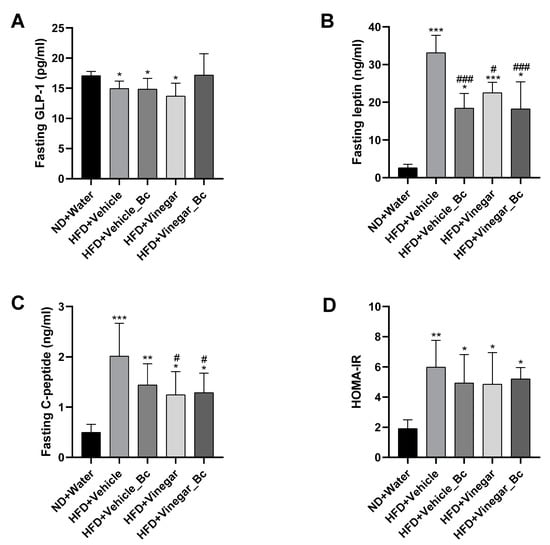 Effect of vinegar ± B. coagulans on GLP-1, Leptin and C-peptide in serum. (A) Fasting serum GLP-1, (B) Fasting serum leptin, (C) Fasting C-peptide levels, (D) Insulin sensibility estimated using average HOMA-IR in each group calculated from fasting serum glucose and fasting serum C-peptide concentrations with the formula: serum C-peptide (nmol L−1) * serum glucose (mmol L−1)/22.5. Abbreviations. ND: Normal diet; HFD: High fat diet; ND+Water: Normal diet plus water; HFD+Vehicle: High fat diet plus vehicle (non-vinegar), HFD+Vehicle_Bc: High fat diet plus vehicle and B. coagulans; HFD+Vinegar: High fat diet plus vinegar; HFD+Vinegar_Bc: High fat diet plus vinegar and B. coagulans Data are expressed as mean ± SD. * p < 0.05, ** p < 0.01, *** p < 0.001 vs. ND group, # p < 0.05, ### p < 0.001 vs. HFD+Vehicle. (n = 6 mice per group).