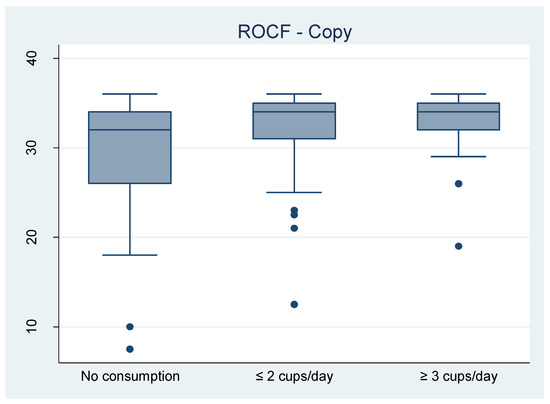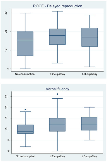 The distributions of the five raw test scores measuring NCP (ROCF—direct copy and delayed reproduction, verbal fluency, coding, TMT B-A) are presented as boxplots. We stratified by coffee consumption, comparing the distributions of test scores in the three groups: no consumption, ≤ 2 cups/day and ≥ 3 cups/day (Figure 1).