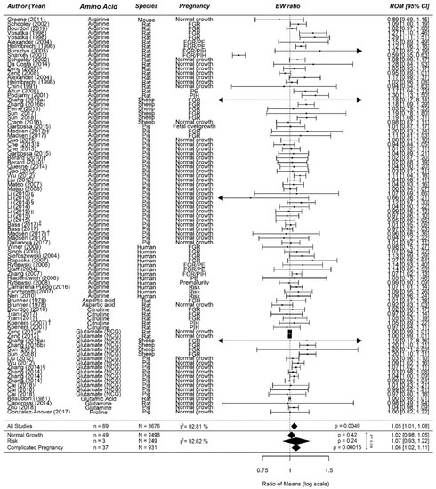 Supplementation of prenatal AA from the arginine family increases birth weight by 6% (1.06 (1.02; 1.11)) in complicated pregnancies (Figure 1). No effect was observed in normal-growth pregnancies (1.01 (0.98; 1.05)) or the risk population (1.07 (0.93; 1.22)). In animal studies only, no differences were observed in normal pregnancies and arginine increased birth weight by 8% (1.08 (1.03; 1.13)) in complicated pregnancies. There were no at-risk studies conducted in animals. In human studies only, no differences were observed in normal-growth pregnancies and an increase in at-risk pregnancies (ROM 1.08 (1.02; 1.13) or MD 219 g (65; 374)) and complicated pregnancies (ROM 1.07 (1.03; 1.11) or MD 162 g (69; 255)).