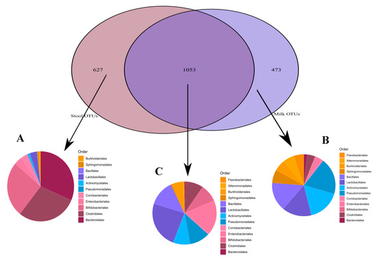 Figure 2. Operational taxonomic units (OTUs) order-level taxonomical assignments. (A) Stool-unique OTUs; (B) Milk-unique OTUs; (C) Shared OTUs (OTUs appearing in at least one milk and one stool sample).