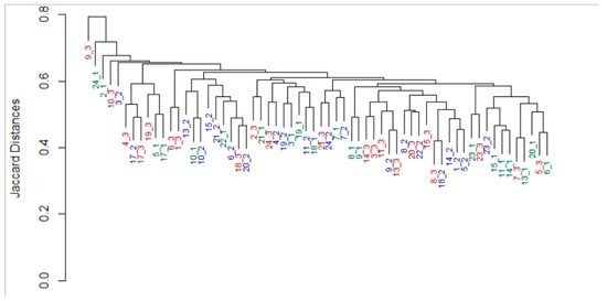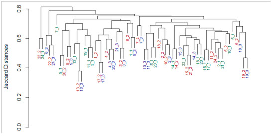 Figure 3. Subject identity in maternal microbiome. Dendrogram based on nearest neighbor joining of samples according to the Jaccard distance matrix of milk microbiome samples. Leaf labels show Subject ID and the time the sample was collected (green_week postpartum, red_one month postpartum, blue_three months postpartum). Analysis of similarities (ANOSIM): p = 0.002 R = 20%. No data were available for participants number 12 and 16.
