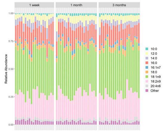 In the milk samples, we were able to identify 19 fatty acids, nine of which constituted the dominant part of human milk fat (Figure 5). In general, fatty acid composition did not differ substantially across mothers, and the composition remained relatively stable throughout the three months of the study. Saturated fatty acids constituted a lower fraction of milk lipids, as observed previously for Israeli women [39,40], and in contrast to other populations [27,41], probably as a result of the Israeli diet.
