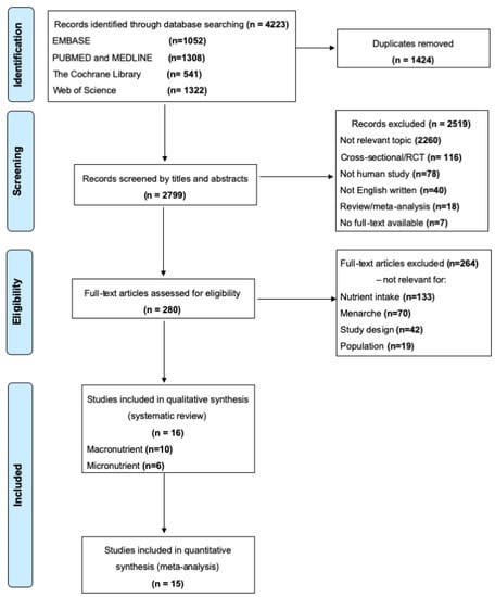 4223 records were identified. After removing 1424 duplicates, we excluded 2519 records based on screening titles and abstracts. Of the remaining papers, 264 of 280 were removed after the full text had been assessed for eligibility. Finally, 16 longitudinal studies involving 10,884 girls were selected for systematic review and meta-analysis in the present study (Figure 1).