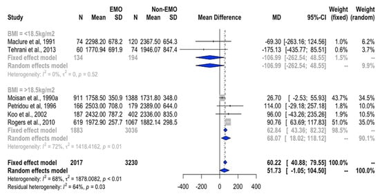 Forest plot of WMD of EI between EMO and NEMO groups stratified by BMI < 18.5 kg/m2 and BMI ≥ 18.5 kg/m2. Definition of abbreviations: EMO, earlier menarche onset; NEMO, non-early menarche onset; MD, mean difference; WMD, weighted mean difference.