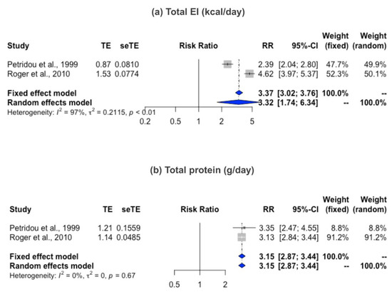 Girls with EMO had a higher WMD of total EI than girls with NEMO with the existence of heterogeneity (I2 = 68%, p < 0.01, Table 2). Given that the meta-regression identified a possible effect of baseline BMI on the EI–EMO relationship (Table S4), we then performed subgroup analysis. For girls with BMI ≥ 18.5 kg/m2, the WMD of EI remained significantly higher in the girls with EMO than in the girls with NEMO (WMD = 68.1 kcal/day, 95%CI = 18.0 to 118.1 kcal/day, Figure 2). Additional analysis showed that the higher EI was positively associated with EMO risk (RR = 3.3, 95% CI = 1.7 to 6.3; Figure 3a).