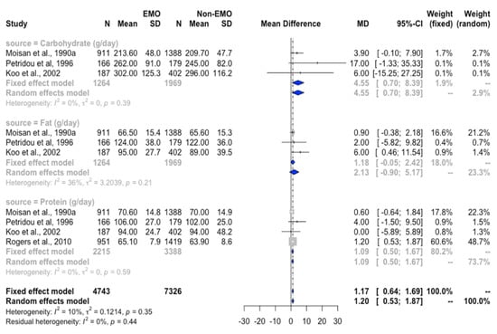 Forest plot of WMD of carbohydrate, protein, and fat intakes between EMO and NEMO groups in healthy girls with BMI ≥ 18.5 kg/m2. Definition of abbreviations: EMO, earlier menarche onset; NEMO, non–early menarche onset; MD, mean difference; WMD, weighted mean difference.