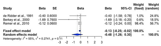 Pooled estimated results were calculated using the random-effect models to reflect variability in all studies. To assess between-study heterogeneity, Cochran’s Q test was used to obtain p values and I2 value. An I2 > 50% or a p < 0.05 indicated heterogeneity across studies [31]. To detect publication bias, we used Egger’s regression test, and p < 0.1 has been recommended to indicate significant publication bias [32,33]. Meta-regression was performed to determine whether the baseline characteristics affected the heterogeneity across studies. Modifier factors were country (Canada, Chile, Colombia, England, Iran, Germany, Greece, Iran, Netherland, United States) [13,16,26,34], baseline body mass index (BMI) [12,13,19], age at dietary assessment (years old) [12,14,21], dietary measurement method (dietary record, food frequency questionnaire (FFQ) [13,14,16,18,22,27,28], physical activity (hours/week) [12,18,26], maternal AAM (years old) [12,18,19,28], and socioeconomic status (high, middle, low) [12,14,19,27,35]. When p < 0.05, subgroup analyses were applied.