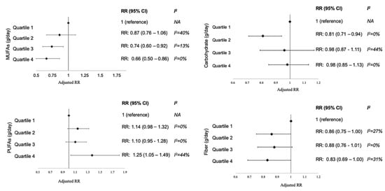 RR of menarche according to quartiles of MUFAs, PUFAs, carbohydrate, and fiber intakes among EMO and NEMO groups. Definition of abbreviations: CI, confidence interval; EMO, earlier menarche onset; MUFAs, monounsaturated fatty acids; NEMO, non-early menarche onset; PUFAs, polyunsaturated fatty acids; RR, risk ratio.