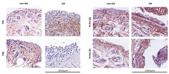 Immunohistochemical analysis of synovial membranes from OA (osteoarthritis) and non-OA patients. Left panel: Slices were stained with anti-CB1 and anti-CB2 receptor antibodies. Right panel: Slices were stained with anti-PI-PLC β2 and anti-PI-PLC β3 antibodies. Slides were counterstained with hematoxylin and mounted with permanent mounting media. This figure shows representative images of different experiments (n = 5 non-OA and n = 6 OA).