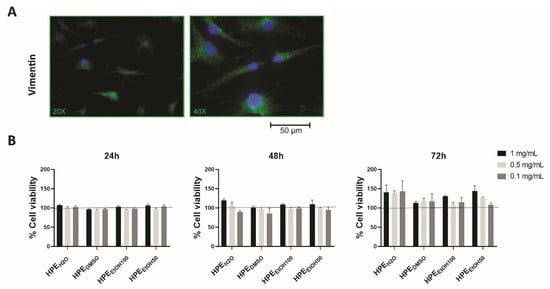 Characterization of human primary synoviocytes (FLSs) and analysis of cell viability. (A) Human primary FLSs, isolated by synovial membranes and cultured in vitro, were stained with anti-vimentin primary antibody and with Alexa Fluor 488 (green) secondary antibody. (B) Cell viability was assessed by the MTS colorimetric method, and FLSs were treated with three concentrations, 1, 0.5, and 0.1 mg/mL of Harpagophytum procumbens root extract (HPE) dissolved in deionized water (HPEH2O), DMSO (HPEDMSO), 100% v/v EtOH (HPEEtOH100), and 50% v/v EtOH (HPEEtOH50), for 24, 48, and 72 h. Cell viability of treated samples was normalized to the untreated cells, which is reported as 100% and represented by a horizontal line.