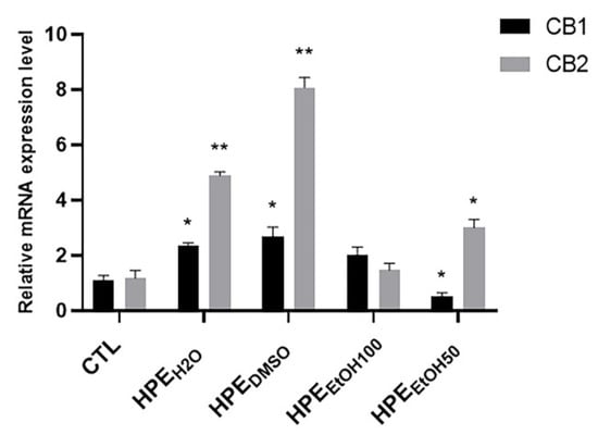In order to assay the effects of the different extracts on cannabinoid receptor expression, they were added to cell culture medium at a concentration of 0.1 mg/mL for 24 h, then, the mRNA expression level of CB1 and CB2 receptors was analyzed. The HPEH2O and HPEDMSO and to a lesser extent, HPEEtOH50, were able to increase the CB2 mRNA expression level, whereas HPEEtOH100 did not show any effect (Figure 3). CB1 receptor mRNA expression level was increased by HPEH2O and HPEDMSO and to a lesser extent by HPEEtOH100, whereas it was decreased by HPEEtOH50 (Figure 3).