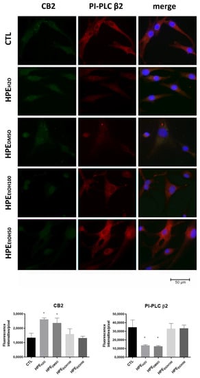 Considering that only CB2 receptors are associated with inflammation and pain in peripheral tissues, we verified whether the CB2 receptors also increased at the protein level by immunofluorescence staining. FLSs were treated with 0.1 mg/mL extracts for 24 and 48 h, then, the cells were stained with antibody anti-CB2. We found that HPEH2O and HPEDMSO extracts were able to stimulate the exposure in membrane of CB2 receptors, both at 24 and 48 h, whereas HPEEtOH50 and HPEEtOH100 did not stimulate CB2 receptor expression at any analyzed time (Figure 4 and Figure S1). Taking into account that the expression of PI-PLC β2 was increased in synovial membranes from OA patients, we verified whether the HPE extracts were able to reduce the production of this phospholipase. HPEH2O and HPEDMSO were able to inhibit the expression of PI-PLC β2, whereas HPEEtOH50 and HPEEtOH100 did not show effects (Figure 4).