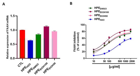 Moreover, further anti-inflammatory mechanisms are affected, as shown by the inhibition of FAAH in all the analyzed HPE extracts. The best inhibition was shown by HPEEtOH100 and HPEEtOH50, so we can hypothesize that volatile compounds, such as β-caryophyllene, eugenol, and α-humulene, can be involved in these HPE effects.