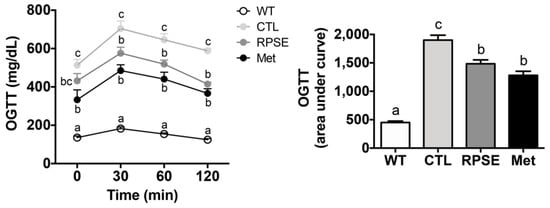 Given that hyperglycemia was rescued by RPSE supplementation, we assessed whether this benefit of RPSE is dependent on gaining insulin sensitivity (Figure 1). For OGTT, glucose bolus (2 g/kg bw) was administered by oral gavage to mice after 4 h of fasting, and blood glucose was measured at 30, 60, and 120 min post-administration. In the db/+ mice, the concentration of blood glucose reached a peak at 30 min post-administration and returned to a normal level within 2 h (p < 0.001). This result indicated that db/+ mice sustained sufficient glucose homeostasis. In contrast, the db/db control showed the highest glucose levels throughout the measuring points, which meant a successful induction of T2DM insulin resistance. The comparative drug metformin recovered insulin sensitivity i.e., postprandial glucose levels were remarkably decreased throughout measuring points, and the AUC was significantly decreased by 33% compared to the control (p < 0.001).