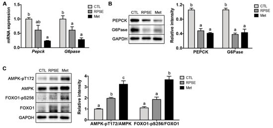 Red pepper seed extract (RPSE) improved the gene and protein expression related to hepatic gluconeogenesis in db/db mice. (A) mRNA expression of Pepck and G6Pase. (B) representative immunoblotting of PEPCK and G6Pase. (C) Representative immunoblotting of AMPK and FOXO1. The relative intensities by densitometry are shown. Expression levels were normalized to GAPDH. CTL, db/db mice treated with vehicle; RPSE, db/db mice treated with RPSE 200 mg/kg bw; Met, db/db mice treated with metformin 150 mg/kg bw. Values are expressed as mean ± SEM (n = 4). a–c Means in the row indicated by different alphabets are significantly different between groups (p < 0.05). AMPK, AMP-activated protein kinase; FOXO1, forkhead box protein O1; PEPCK, phosphoenolpyruvate carboxykinase; G6Pase, glucose 6-phosphatase; GAPDH, glyceraldehyde 3-phosphate dehydrogenase.