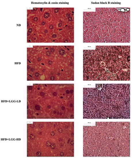 H&E staining and SBB staining were performed to confirm the effect of a high-fat diet supplemented with LGG on the hepatic morphology and lipid accumulation in mice. The liver specimens from mice fed a high-fat diet had more lipid accumulation than those from mice fed a normal diet or a high-fat diet supplemented with LGG. Moreover, mice fed a high-fat diet exhibited microvesicular and macrovesicular liver steatosis, whereas the hepatic histology of mice fed the HFD+LGG-HD diet showed fewer hepatic lipid droplets (Figure 2).