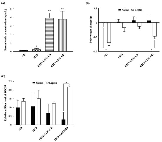 Effect of administration of Lactobacillus rhamnosus GG (LGG) on serum leptin concentrations and leptin responsiveness to exogenous leptin treatment of mice with diet-induced obesity. (A) Serum leptin concentrations. Bar marked with a star * or double stars ** means that it is significantly different from the ND group at p < 0.05 or p < 0.01, respectively. (B) Body weight change after treatment with exogenous leptin. Bar marked with a star * means that it is significantly different from the control (saline) at p < 0.05. (C) Relative hypothalamic mRNA expression level of SOCS3 gene. The data are expressed as relative fold change compared with the ND group given saline, which is set as 1. Bar marked with a star * means that it is significantly different from the control (saline) at p < 0.05. ND: normal diet; HFD: high-fat diet; HFD+LGG-LD: high-fat diet supplemented with low-dose LGG (108 CFU/mouse/day); HFD+LGG-HD: high-fat diet supplemented with high-dose LGG (1010 CFU/mouse/day). All data are expressed as mean ± SD (n = 5).