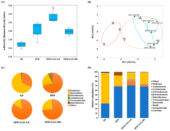 Effect of administration of Lactobacillus rhamnosus GG (LGG) on the fecal microbiota of mice with diet-induced obesity. (A) Boxplot representation of Shannon diversity index. Bar marked with a star * means that it is significantly different from the ND group at p < 0.05. (B) Two-dimensional plot of principal component analysis. (C) Fecal microbial composition at phylum level. (D) Fecal microbial composition at class level. ND: normal diet; HFD: high-fat diet; HFD+LGG-LD: high-fat diet supplemented with low-dose LGG (108 CFU/mouse/day); HFD+LGG-HD: high-fat diet supplemented with high-dose LGG (1010 CFU/mouse/day).