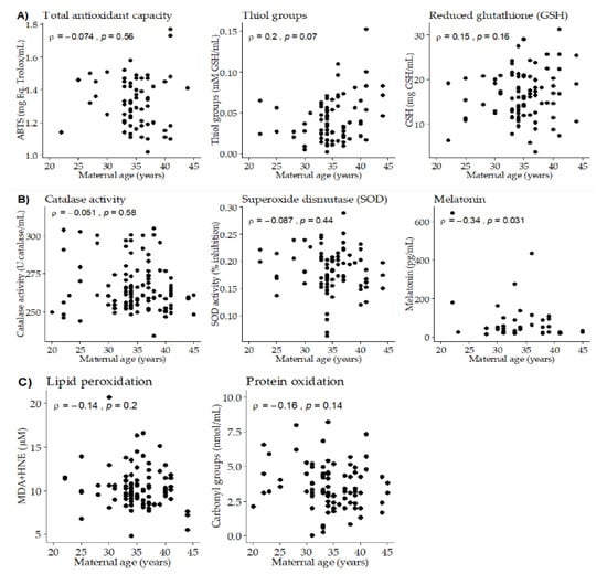 Scatter plots of breast milk antioxidants and oxidative damage biomarkers versus maternal age. (A) Total antioxidant capacity and low molecular weight antioxidants. (B) Antioxidant enzymes. (C) Oxidation biomarkers. Rho–Spearman test (ρ) and associated p-values are shown in each plot.