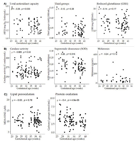 Scatter plots of breast milk antioxidants and oxidative damage biomarkers versus gestational age. (A) Total antioxidant capacity and low molecular weight antioxidants. (B) Antioxidant enzymes. (C) Oxidation biomarkers. Rho–Spearman test (ρ) and associated p-values are shown in each plot.
