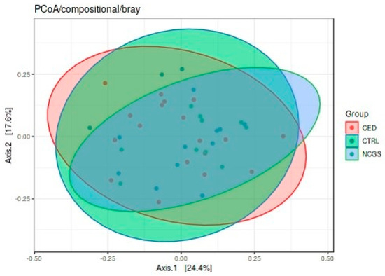 Total microbiota profiles of study subjects were comparable between the groups as assessed by Principal Component Analysis (PCoA). CED celiac disease (n = 19), NCGS non-celiac gluten sensitivity (n = 10) and CTRL healthy controls (n = 14).