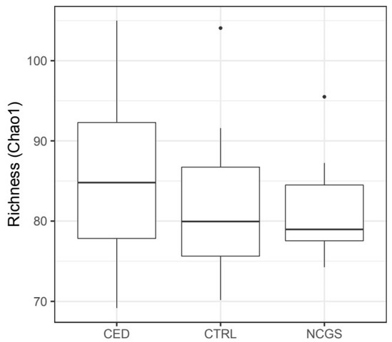 Microbiota richness was comparable in subjects with celiac disease (CED) (n = 19), non-celiac gluten sensitivity (NCGS) (n = 10) and healthy controls (CTRL) (n = 14). The box extends from 25th percentile to 75th percentile, with a line at median.
