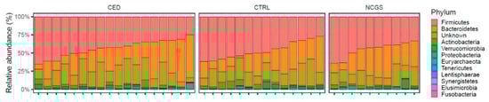 Relative abundances of bacterial phyla (% of total reads) in subjects with celiac disease (CED) (n = 19), healthy controls (CTRL) (n = 14) and subjects with non-celiac gluten sensitivity (NCGS) (n = 10). No statistically significant differences were observed between the study groups.
