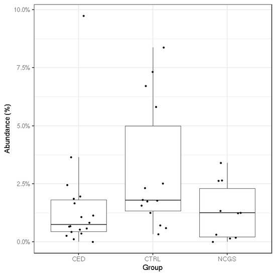 The mean relative abundance of Bifidobacterium in subjects with celiac disease (CED) (n = 19), healthy controls (CTRL) (n = 14) and subjects with non-celiac gluten sensitivity (NCGS) (n = 10). The difference between the three was borderline significant (p = 0.067; Kruskal–Wallis test).