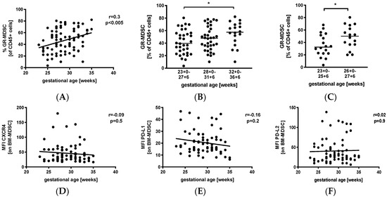 Quantification of granulocytic myeloid-derived suppressor cells (GR-MDSC) in the breast milk of preterm infants (dependency on gestational age). Milk cells were isolated from the breast milk of mothers of preterm infants during the first five weeks of life. Percentages of GR-MDSC (of total CD45+ leucocytes) and the expression of activation markers CXC-motif chemokine receptor 4 (CXCR4), programmed death ligand-1 (PD-L1), and programmed death ligand-2 (PD-L2) on breast milk containing a large population of GR-MDSC (BM-MDSC) were determined by flow cytometry. The mean percentages of BM-MDSC and the mean mean fluorescence intensity (MFI) of activation markers over the first five weeks were calculated. (A) Scatter diagram showing the percentage of GR-MDSC of total milk leucocytes depending on gestational age. Regression line shows the correlation between percentages of BM-MDSC and gestational age. n = 86, Spearman correlation. (B) Scatter diagram showing the percentage of GR-MDSC of milk leucocytes from mothers of preterm infants delivered at <28 0/7 WOG, between 28 0/7 and 31 6/7 WOG and >32 0/7 WOG. n = 18–34, * p < 0.05; Kruskal–Wallis test and Dunn’s multiple comparison test. (C) Scatter diagram showing the percentage of BM-MDSC from mothers of preterm infants delivered at <26 0/7 WOG, between 26 0/7 and 27 6/7 WOG, * p < 0.05; Mann–Whitney test. (D–F) Scatter diagrams showing the expression of CXCR4 (D), PD-L1 (E) and PD-L2 (F) on BM-MDSC depending on gestational age. Regression line shows the correlation between percentages of BM-MDSC and postnatal age. n = 86, p > 0.05, Spearman correlation.