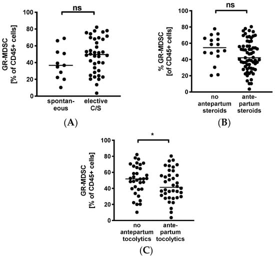 Quantification of GR-MDSC in the breast milk of preterm infants (maternal characteristics). Milk cells were isolated from the breast milk of mothers of preterm infants during the first five weeks of life. Percentages of GR-MDSC of total CD45+ leucocytes were determined by flow cytometry. The mean percentage of BM-MDSC was calculated. (A–C) Scatter diagrams showing the expression of GR-MDSC in breast milk of women who delivered spontaneously and of women who delivered by elective cesarean section (A), in women who received antepartum steroids and who did not (B), and in women who received antepartum tocolytics and who did not (C). n = 11–65, * p < 0.05, ns not significant, Mann–Whitney test.