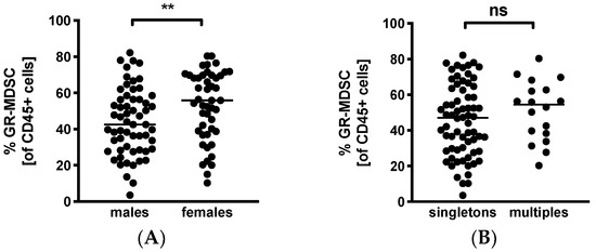 Quantification of GR-MDSC in breast milk of preterm infants (infant characteristics). Milk cells were isolated from the breast milk of mothers of preterm infants during the first five weeks of life. Percentages of GR-MDSC of total CD45+ leucocytes were determined by flow cytometry. The mean percentage of GR-MDSC was calculated. A+B Scatter diagrams showing the expression of GR-MDSC in breast milk of mothers of female and male infants (A) and singletons and multiples (B). n = 18–68, ** p < 0.005, ns not significant, Mann–Whitney test.