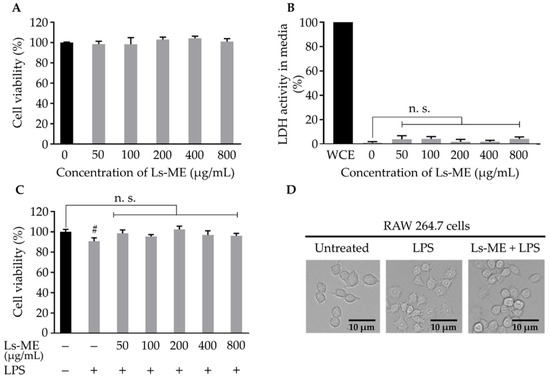 The effects of Ls-ME on the viability and morphology of LPS-stimulated RAW 264.7 cells. Cells were treated with various concentrations of Ls-ME for 24 h. (A) Cell viability and (B) LDH activity were examined. LDH activity in whole-cell extract (WCE) is represented as 100% activity and used as the control. The effects of Ls-ME on cell viability after LPS stimulation are demonstrated in (C). The morphology of cells was examined in three groups: the untreated group with medium only, group treated with LPS (LPS-1 µg/mL) for 18 h, and Ls-ME + LPS pretreatment group (Ls-ME 200 μg/mL for 24 h) (LPS-stimulation was performed for 18 h). The morphology of the cells is shown in (D). The results are represented as mean ± SD (n = 6). Scale bar indicates 10 µm in (D); # p < 0.05; n. s., not significant in comparison with the untreated group.