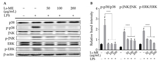 The inhibitory activity of Ls-ME on LPS-induced phosphorylation of MAPKs signaling pathway in RAW 264.7 macrophages. Cells were cultured with serial concentrations of Ls-ME for 24 h, followed by treatment with LPS (1 µg/mL) for 18 h. The expression of total p38, JNK, ERK½, and phosphorylated p-p38, p-JNK, p-ERK½ were examined using Western blot analysis (A). Relative band intensities were analyzed using Image J (B). Data of the three replicates are represented as mean ± SD. # p < 0.05 is expressed in comparison with cells incubated alone; **** p < 0.0001 is expressed in comparison with LPS treatment only.