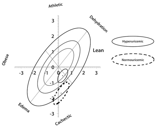 Z Score of normouricemic and hyperuricemic patients by Bioelectrical Impedance Vector Analysis (BIVA). Continuous line represent hyperuricemic subjects and dotted line represent normouricemic subjects.