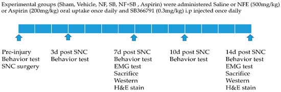 The rats were randomly divided into six groups. A scheme of the protocol followed is shown in Figure 1. Experimental groups were the sham group (Intact, saline 10 mL/kg), in which animals did not undergo any surgical procedures; the vehicle group (SNC, saline 10 mL/kg), which received the sciatic nerve crush (SNC) injury and were treated with physiological saline; the NF group (SNC, NFE 500 mg/kg), which received the crush injury and were treated with NFE 500 mg/kg oral uptake once daily after surgery; and, the aspirin group (SNC, 200 mg/kg), which received the crush injury and were treated with aspirin (200 mg/kg) through oral uptake once daily after surgery. Aspirin (Bayer, Inc., Hanover, NJ, USA) as a positive control was dissolved in physiological saline. The SB group (SNC, SB366791 0.3 mg/kg) which received the crush injury were intraperitoneally injected once daily at 0.3 mg/kg. The SB-366791 (Enzo Life Sciences, Farmingdale, NY, USA) as a TRPV1 antagonist was purchased from Enzo (Farmingdale, NY, USA), dissolved in 100% ethanol (10 mg/mL with warming) and diluted in physiological saline. SB366791 [N-(3-methoxyphenyl)-4-chlorocinnamide] is a more selective and in vivo is also a more potent TRPV1 antagonist than the commonly-used TRPV1 antagonist capsazepine [28], and has been widely used as a selective TRPV1 antagonist in pain research [29,30,31]. The SB + NF group (SNC, NFE 500 mg/kg + SB366791 0.3 mg/kg) which received the crush injury were intraperitoneally injected once daily at 0.3 mg/kg, with NFE 500 mg/kg given via oral uptake once daily after surgery.