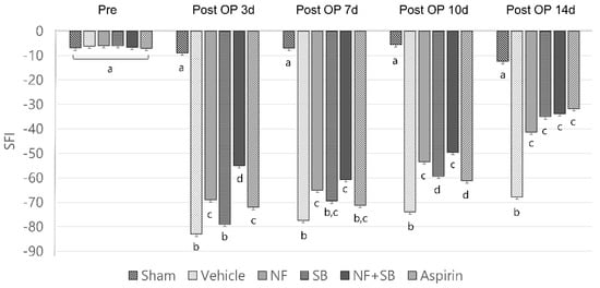 A number of experimental injuries and treatments have shown that SFI is a significantly useful tool for the evaluation of functional recovery of the sciatic nerve of rats [33]. Walking ability was measured in order to determine the effect of the NF, SB, and NF + SB treatment on functional recovery after sciatic nerve injury. Evaluation of SFI was performed pre-injury and on the 3rd, 7th, 10th, and 14th day after sciatic crush nerve injury. In the walking track, the NF group (−68.9 ± 3.7, −65 ± 5.1, −53 ± 1.6, −41 ± 5.0; p < 0.05), SB group (−78.9 ± 2.8, −69.5 ± 5.5, −59.3 ± 2.0, −35 ± 6.7; p < 0.05), and NF + SB group (−75.8 ± 3.7, −69.1 ± 2.8, −55.6 ± 1.6, −43.1 ± 5.4; p < 0.05) showed significant differences compared to the vehicle group (−82.9 ± 5.8, −77.3 ± 6.6, −73.8 ± 3.0, −55.1 ± 3.6) in SFI values on the 3rd, 7th, 10th, and 14th day after injury (Figure 2). This implies that the NF in the sciatic nerve injury affects the recovery of gait function. Also, the SB and NF + SB treated group showed a recovery of gait function similar to the NF treated group.