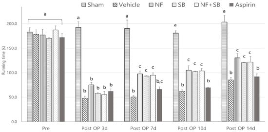 The rotarod test using the rotarod device evaluated exercise deficit and balance. We can evaluate motor and sensory input as measures of coordination on the rotarod. In the rotarod test, the NF group (97 ± 20, 104 ± 32, 130 ± 30; p < 0.05), SB group (93 ± 10, 102 ± 19, 120 ± 36; p < 0.05), and NF + SB group (95 ± 17, 103 ± 17, 121 ± 40; p < 0.05) showed significant differences compared to the vehicle group (50 ± 11, 62 ± 11, 85 ± 17) in total riding time at the 7th, 10th, and 14th day (Figure 3).