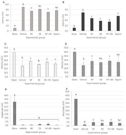 Electromyography (EMG) indicated that regenerated nerve fibers had successfully reinnervated with the gastrocnemius muscle (GCM). Nerve conductive velocity (NCV) showed remyelinated nerve fiber conditions and amplitude reflected regenerative axon nerve fiber condition. Nerve conduction study (NCS), Latency, CMAP amplitude were conducted on the control group and the experimental group at the 7th and 14th day after sciatic nerve crush injury. In the EMG test, it was confirmed that latency values were decreased in the group treated with NF and NF + SB at the 7th day (Figure 4A) and NF, SB, and NF + SB on the 14th day (Figure 4B) after the sciatic nerve crush injury. The nerve conduction velocity (NCV) values were increased in the nerve conduction study in the group treated with NF and NF + SB on the 7th (Figure 4C) and the 14th day (Figure 4D) after the sciatic nerve crush injury. Moreover, CMAP amplitude was increased in the nerve conduction study in the groups treated with NF and with NF + SB on the 14th day (Figure 4F) after the sciatic nerve crush injury compared to the vehicle group. NF and NF + SB treatment indicated that more regenerative axons and reinnervated GCM, which might also lead to a significantly higher CMAP amplitude (p < 0.05) in comparison with that of the vehicle group.