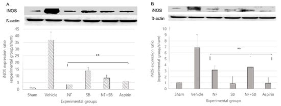 The toxic free radical nitric oxide (NO), produced by induced nitric oxide synthase (iNOS) in macrophages, and participates in an early non-specific immunological reaction associated with cytotoxicity [34]. Peripheral nerve injury is also associated with local upregulation of iNOS in macrophages and Schwann cells [35,36,37] with subsequent NO release. At the 7th and 14th day after surgery, a sciatic nerve sampling was performed for western blot analysis. In the vehicle group, iNOS expression was increased compared to the sham group at the 7th and 14th day. However, the expression of iNOS showed a significantly suppressive effect in the NF (p < 0.01), SB (p < 0.01), and NF + SB (p < 0.01) treated groups at the 7th (Figure 7A) and 14th day (Figure 7B) compared to the vehicle group.